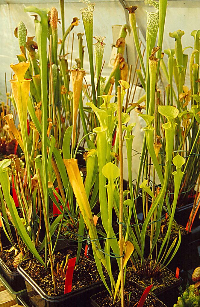 un immenso bancale centrale, ricoperto di Sarracenie (e, in fondo, alcune drosere), e due
